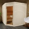 Met de Azalp Massieve hoeksauna Genio haal je een praktische en comfortabele binnen sauna in huis die perfect past in een hoek van de kamer. De stevige constructie van vurenhout is verkrijgbaar met wanden van 45 of 60 mm dik, wat zorgt voor een duurzame opbouw en een aangename warmtebeleving. Drie banken maken het ontspannen extra comfortabel, of je nu rechtop zit of even wilt liggen. De elementopbouw zorgt ervoor dat de montage vlot verloopt, waarbij we in een ander stuk tekst dieper ingaan op de details. Deze hoeksauna is ideaal voor wie comfort en ruimtebesparing wil combineren in één stijlvol ontwerp.