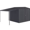 Je kan het afdak desgewenst links, rechts of aan beide kanten aanbouwen. De opbouwset bevat ook de steunpalen en het bevestigingsmateriaal.