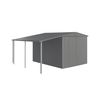 Je kan het afdak desgewenst links, rechts of aan beide kanten aanbouwen. De opbouwset bevat ook de steunpalen en het bevestigingsmateriaal.