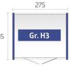 - De blauwe balk geeft de regengoot aan en toont de mogelijke montagezijde (vanaf de Highline H2) van een extra zijdak.