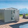 Dit tuinhuis is gemaakt van vuurverzinkt, polyamide emailgecoate staalplaten. Dat houdt in dat het staal eerst in een thermisch bad is ondergedompeld voor een zinklaag en hierna aan beide zijden voorzien van een voorbehandeling, grondlaag en uiteindelijk een polyamide emailcoat om hem op kleur te krijgen. Corrosie krijgt hierdoor geen kans. Het materiaal is zo sterk dat windkracht twaalf geen enkel probleem is. Ook in de winter staan jouw spullen droog want de berging is vochtwerend, vorstbestendig en het dak kan tot wel 150 kg sneeuw per vierkante meter dragen. Een erg sterk tuinhuis dus!