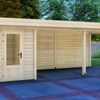 Tuinhuis Bremen is het kleinste tuinhuis van de serie en heeft een afmeting van 200x300 cm. Dit tuinhuis is vervaardigd uit blank* Vurenhout. De Bremen is te bestellen als los tuinhuis, maar kan ook gecombineerd worden met een luifel van 200, 300, 400 of 500 cm. Wil je graag een afgesloten overkapping creëren? Kies dan ook voor een achter- en/of zijwand! De zijwand is 300 cm en past daarbij bij iedere maat luifel. De achterwand is 200 cm, kies daarom bij grotere maten luifels voor twee of meer achterwanden.