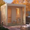 De Karibu Angkor buitensauna is een moderne sauna, voorzien van een klein overdekt terras met een stijlvolle lamellenwand voor extra beschutting. De enkele deur is van glas, daarnaast zit er nog een groot raam aan de voorkant wat zorgt voor maximaal natuurlijk licht. De lamellenwand biedt daarbij precies de juiste balans tussen lichtinval en privacy, zodat je ongestoord kunt ontspannen. Met twee comfortabele banken biedt deze sauna plaats aan maximaal 3 personen, waardoor het een perfecte plek is om in alle rust