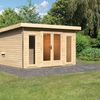 De Karibu Mainburg buitensauna is een schitterende sauna met een L-vormige voorruimte voor extra comfort. De voorruimte biedt niet alleen ruimte om je om te kleden en af te koelen zonder direct de hitte te verlaten, maar helpt ook tocht tegen te gaan bij het openen van de deur, waardoor de sauna warm en comfortabel blijft. Deze sauna is uitgerust met drie banken en biedt ruimte aan maximaal 4 personen. Verkrijgbaar in zowel behandeld als onbehandeld hout, heeft dit model een lessenaars dak en dubbele openslaande deuren met glas, die samen met de twee grote glazen ramen zorgen voor veel natuurlijk licht en een mooi uitzicht.