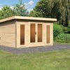 De Karibu Mainburg buitensauna is een schitterende sauna met een L-vormige voorruimte voor extra comfort. De voorruimte biedt niet alleen ruimte om je om te kleden en af te koelen, maar is groot genoeg om te functioneren als tuinhuisje. Deze sauna is uitgerust met drie banken en biedt ruimte aan maximaal 4 personen. Verkrijgbaar in zowel behandeld als onbehandeld hout, heeft dit model een lessenaars dak en dubbele openslaande deuren met glas, die samen met de twee grote glazen ramen zorgen voor veel natuurlijk licht en een mooi uitzicht.