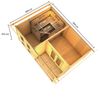 De Karibu Mainburg buitensauna is een prachtige sauna met twee aparte ruimtes: een voorruimte en een afgesloten tuinhuisje. De voorruimte heeft twee grote glazen ramen die zorgen voor veel licht en een mooi uitzicht. Het biedt een plek om af te koelen en om te kleden zonder direct de hitte te verlaten. Het tuinhuisje, verkrijgbaar in zowel behandeld als onbehandeld hout, is voorzien van een klein overkapt terras en dubbele afsluitbare glazen deuren, is ideaal voor extra opslag of ontspanning. De sauna zelf, met drie banken, biedt plaats aan maximaal 4 personen en heeft een modern lessenaarsdak.