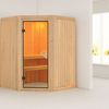 De Karibu Larin is een kleine binnensauna met twee banken, geschikt voor twee personen. Het ontwerp heeft een glazen deur die in de hoek is geplaatst, waardoor deze hoek wordt afgevlakt en een rechte kant krijgt door de deur. Dit unieke ontwerp zorgt voor een moderne uitstraling en maakt optimaal gebruik van de ruimte.