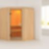 De Karibu Nanja is een compacte binnensauna met twee banken, geschikt voor twee personen. Het ontwerp heeft een glazen deur die in de hoek is geplaatst, waardoor deze hoek wordt afgevlakt en een rechte kant krijgt door de deur. Dit unieke ontwerp zorgt voor een moderne uitstraling en maakt optimaal gebruik van de ruimte. Ideaal voor wie op zoek is naar ontspanning in een kleinere, maar sfeervolle omgeving.