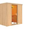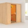 Met de Karibu Fanja haal je een toegankelijke en sfeervolle binnensauna in huis die warmte en licht combineert. De glasdeur laat veel licht binnen en geeft de cabine een open karakter, terwijl de 68 mm dikke wanden van vurenhout zorgen voor een aangename temperatuur en goede isolatie. De twee banken bieden een comfortabele plek om te zitten of te liggen, afhankelijk van je voorkeur. Dankzij het niet-hoekige ontwerp past deze sauna moeiteloos in verschillende ruimtes. De Fanja is ideaal voor wie houdt van eenvoud, comfort en een moderne uitstraling.