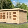 De Schönbuch serie van Karibu is een modern en groot tuinhuis met wanden van 38mm, een lessenaarsdak en twee aparte ruimtes, hierdoor kan je beide ruimtes gebruiken voor verschillende doeleinden. De twee ruimtes worden gescheiden met een tussenwand van 28mm. Gebruik bijvoorbeeld één kant voor het opslaan van tuingereedschap en de andere als klus- of werkruimte.
