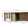 De dubbele openslaande deuren met drie glasvakken van kunstglas bieden gemakkelijke toegang en kunnen worden afgesloten met een hangslot voor extra veiligheid. Een extra lang raam in de hoek met acht glaspanelen van kunstglas zorgt voor extra lichtinval, wat handig is bij het gebruik van de ruimte als bijvoorbeeld een werkplaats. Dit tuinhuis kan worden uitgebreid met een overkapping van 2,40 of 2,80 meter, en met of zonder zij- en achterwanden.