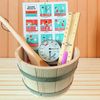Starter set voor sauna. Bestaat uit: Thermo-Hygrometer, zandloper, scheplepel Classic, emmer van vurenhout (4L), bordje met saunaregels.
