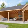 De kapschuur Decis van Kirk & Michaels is een echte blikvanger in de tuin die voor verschillende doeleinden gebruikt kan worden. Het frame bestaat uit geschaafd Douglashout met slanke staanders van 14 x 14 cm. De stijl van deze overkapping met kapschuur dak is voor iedereen die van traditioneel houdt, maar toch een stijlvolle overkapping als echte toevoeging in de tuin wilt. Doordat de Decis een extra hoge nok heeft en aan de voorkant hoger is dan de achterkant, geeft de overkapping een ruimtelijk gevoel. Dit zorgt voor een prachtige sfeer in de tuin en creëert een mooie plek voor al uw zomerse barbecues, tuinfeesten of voor een mooie loungeplek, waar je samen met vrienden en familie kan genieten. De Douglashouten wanden zorgen dan ook voor extra bescherming van de elementen.