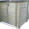 Fietsenberging met de fietsen geplaatst in de rij-richting. Deze berging is volledig geventileerd en heeft een opklapbaar watervast dakdeel gemaakt van betonplex. Het dak loopt licht af en het dakdeel beweegt heel makkelijk door zijn 2 stevige gasveren. De bovenzijde en deursluiting zijn fraai en netjes afgewerkt met een aluminium rand.