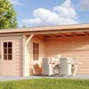 Deze overkapping met berging van WoodAcademy is de perfecte oplossing om je spullen veilig op te bergen en te ontspannen. Het model bestaat uit een Douglashouten overkapping met Douglas wanden, een dubbele deur met half glas en een raam voor meer natuurlijk licht. Het tuinhuis is te gebruiken voor verschillende doeleinden zoals een berging of klusruimte en de overkapping zorgt voor een fijne plek om heel het jaar door van je tuin te kunnen genieten. Het frame bestaat uit fijnbezaagd Douglashout met slanke staanders van 12x12 cm en overstek (tot 60 cm mogelijk) aan de voorkant. Dit geeft het model een traditionele look en feel.